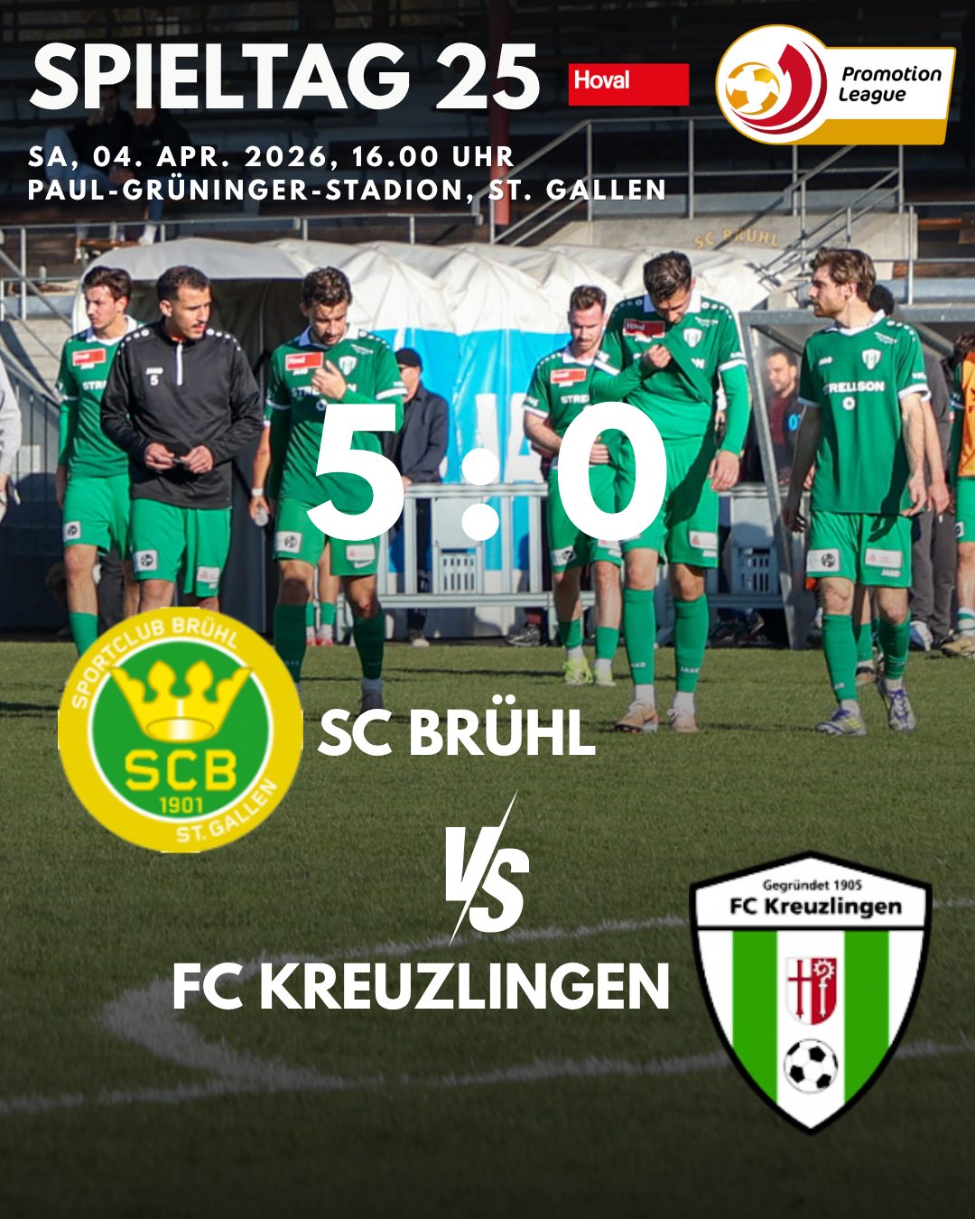 Beim Auswärtsspiel zwischen dem SC Brühl und dem FC Kreuzlingen musste sich der FCK am Ende deutlich mit 5:0 geschlagen geben. Bereits zur Halbzeit lag die Mannschaft mit 3:0 zurück.